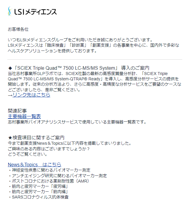 創薬支援事業(治験・非臨床)に関する最新の分析技術情報やウェビナー等のイベント情報を配信しています(無料,毎月1回程度配信)